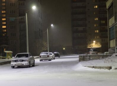 Установлены на столбе светодиодные светильники серии StreetZar 75, которые освещают двор возле жилых домов: